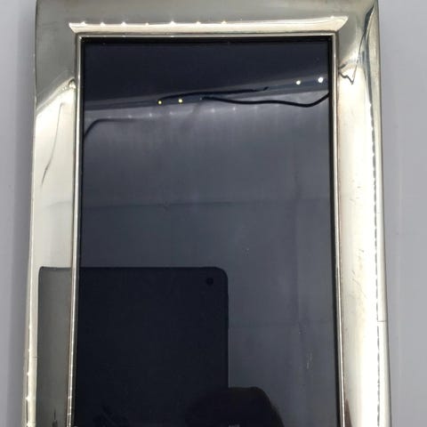 Billedramme - lille, skønvirke, pletsølv, 120 år gl., fra beg. af 1900tal - 88x118mm . med glas, udklappelig. støttefod på bagside så den kan stå - på støttefoden med 2 tårne = plet og HF = formentligt H. Fischer virksom 1893 - 1937 i København - m. patina