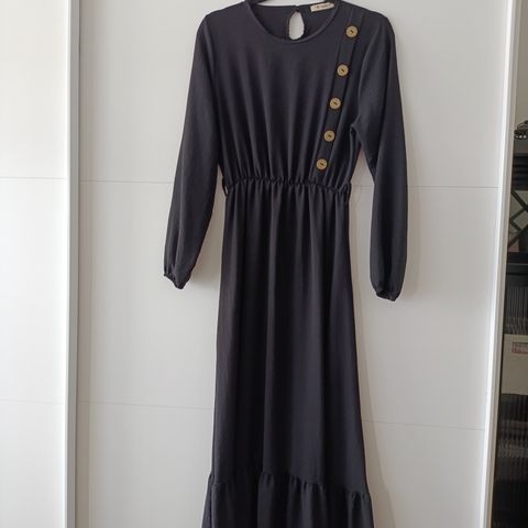 Kjole til særlige lejligheder i størrelse XL til kvinder. Kjolen har lange ærmer og et mønstret design i sort og hvid.