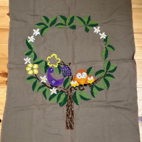Korsstingbroderet stykke, Korsstingsbroderet løber til bordet. Motivet er hyacinthglas med blomstrende hyacinter. Fine farver. Kantningen er en smule ujævn (formodentlig gjort på maskine, men eller er den meget fin . Kan bruges som den er eller måske til kreaopgaver Måler 97x17cm.