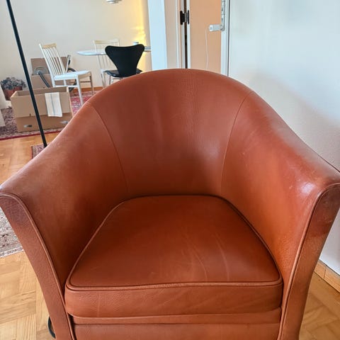 Mogens Hansen, Royal , Kirsebærtræ, Comfort chair alt medfølger, design hynde, og 2 fod læder skammel, alt fremstår nyt 689