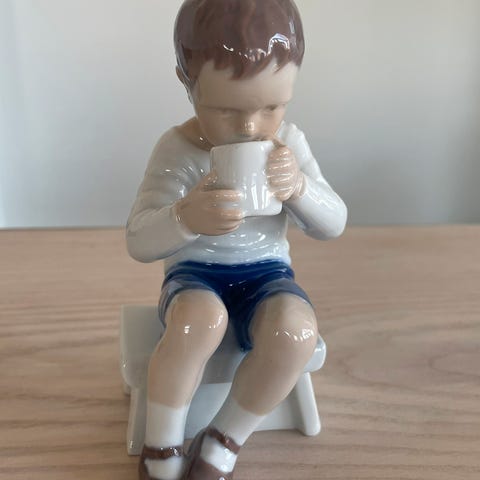 Dreng m kop- figur, Bing &Grøndahl, Nr. 1713. Victor sidder og drikker mælk.