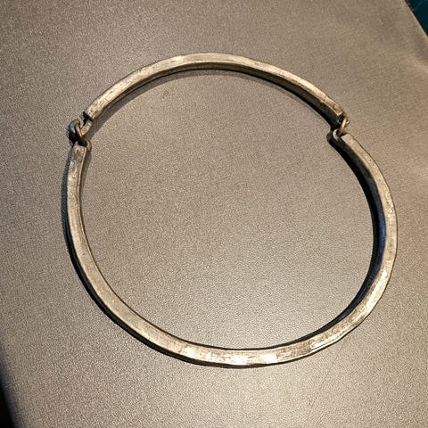 Halsringen har en dia. på 12 cm på tværs og en diameter på 12 cm fra top til vedhæng.