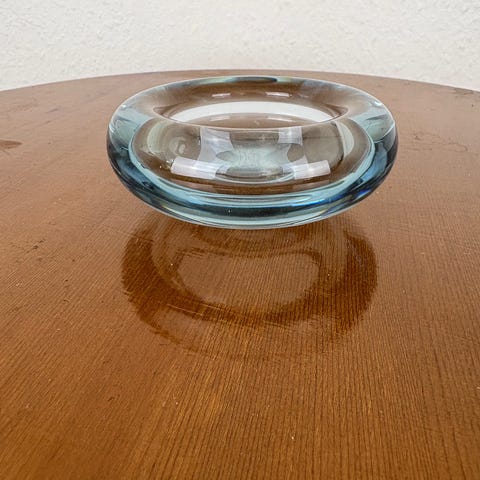 Tungsag på 1285 g. H:9,5. Udvendig Ø: 11 cm. Har en indvendig revne glasset og et par småridser men generelt i pæn stand. Signeret Holmegaard PL.