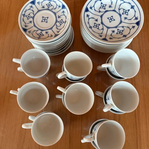 Porcelæn, 5 kagetallerkener og 3 mindre kagetallerkener, Jäger, “Musselmalet”. De 5 største har mærket Jäger Ø 17. De 3 små står der ikke noget mærke under Ø 4,7.