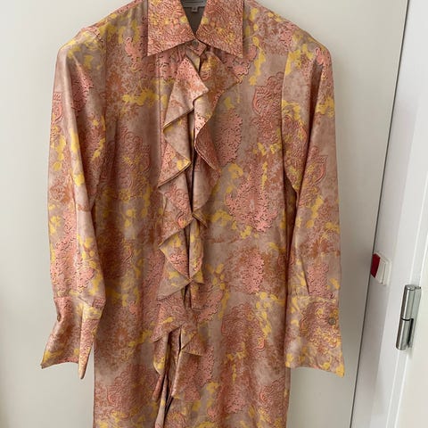 Tunika, Karmamia, str. 38, Sort/pink/gylden, Satin, Næsten som ny, Tunika / kjole med smuk gennem knappet flæse lukning det smukke klassiske Paisley mønster i gyldne og pink farver på sort bund