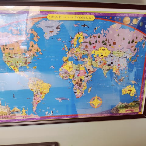 Verdens kort til børn, b: 70 h: 50, Dejlig indrammet plakat, af verdens kontinenter med monumenter og søde smilende dyr.