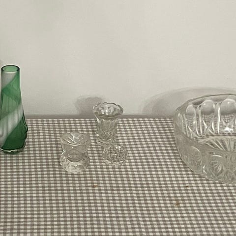 Flakoner 12,5 og 16,5 cm høje: 50 kr. pr. stk. Lille skål ca. 10 cm lang: 20 kr. Lang skål ca. 20 cm lang til f.eks. kam og holder til ringe: 40 kr. pr. stk. Alt er fejlfrit! Sender gerne!