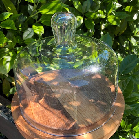 Teak osteklokke. Retro osteklokke på teak fad/bund og plastkuppel. Fin stand. Samlet højde : 11 cm. Ø: på kuppel 18,5 cm. Ø: på fad/bund 22,5 cm.