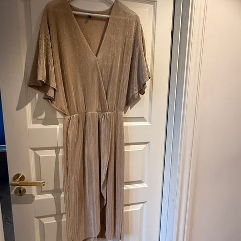 Festkjole, Vero moda, str. M, Guld, God men brugt, Flot guld kjole fra Vero Moda str M i ribbet stof. Lange ærmer med elastik ved håndled. Brugt to gange (nytår) En enkelt tråd er gået en smule op ved halsen. Se sidste billede. 104 cm lang. Elastik ved taljen.