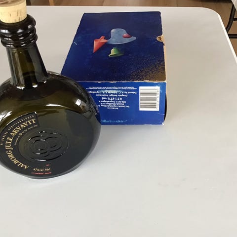 2. Åbnet og med ca 1/4 del indehold tilbage hvorfor den sælges til pynt - pris 30,00 kr.