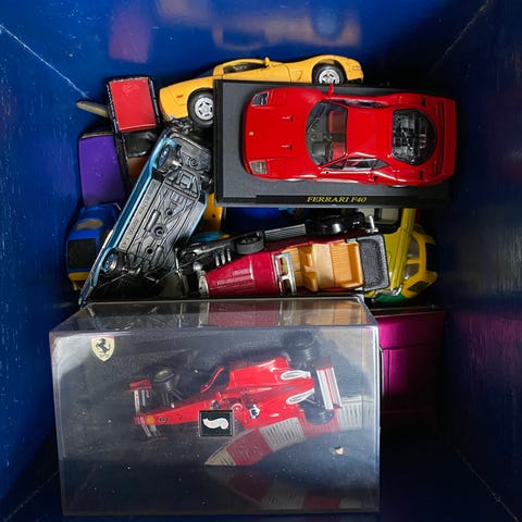 Træfigurer, 2 styk træbiler, ser ud til der mangler en lille træplade under den ene.
