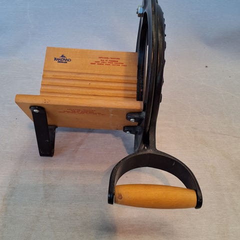 Raadvad brødmaskine / brødskærer, Lang model. Gul vintage med patina. F.eks. som holder/hylde til bøger eller anden dekoration. Samleobjekt.