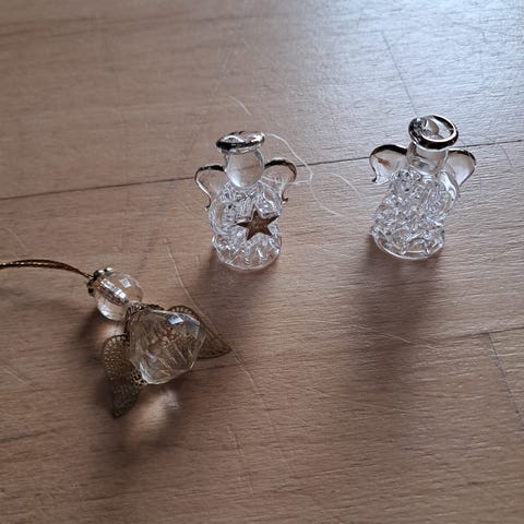 Engle i glas, Et par smukke engle i farvet kjoler. Købt i Gamla Stan, Stockholm i 90’erne.