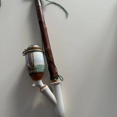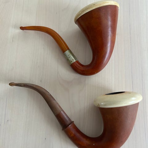 Pibehoved Pibeskaft, Porcelæn, Diverse porcelæn pibehoveder og pibeskafter. Desuden dele til et antikt blæseinstrument. Kan sendes godt indpakket.