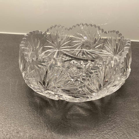 Vintage, Smuk ældre rummelig krystalskål på tre ben. Flotte håndskårede blomstermotiver.