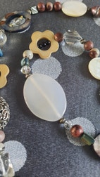 TREKANTEDE ,SMUK BRUN AGAT MED STRIBER,FERSKVANDSPERLER I GRÅBRUN, AGAT,FLADE PERLEMORSSKIVER,SOM BLOMST,OVALE HVIDE MED INDSATTE PERLER !! + EN SMUK OVAL FACETSLEBET KRYSTAL ,AFSLUTTET MED LILLE SØLVLÅS 925 !! DEN MÅLER I LÆNGDEN 80 CM.!!! DENNE SMUKKE UNICA KÆDE KAN KØBES FOR 300 KR !!!!!