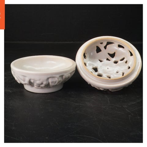 Porcelænskrukke, Hjorth, Stor hvidglaseret keramikkrukke fra Hjorts fabrik, Bornholm. Forskellige relieffer på overfladen hele vejen rundt. Ca 30 cm høj, 25 cm bred (diameter). Afhentes i Lyngby.