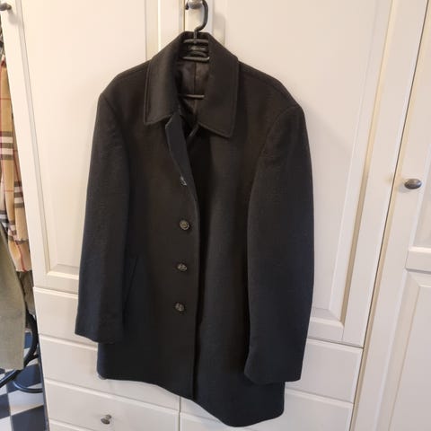 Meget smuk og stilfuld frakke fra Harrods i London, Frakken er ny og ubrugt. Frakken er fremstillet i sort kraftig uld med militær decor på ærner og meget smukke "guld" logo militære knapper på ærmer og ned foran på frakken. Smuk enkel stilfuldt design.