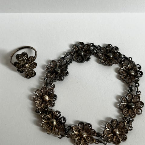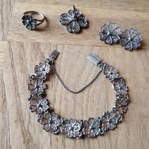 Volmer Bahner Smykkesæt, sølv, Børnesæt i sølv med blomster i emalje bestående af armbånd l ca 14,5 cm broche Ø ca 3 cm samt lille fingerring (defekt se fotos) samlet pris