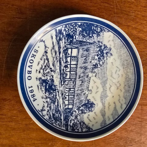 En fin gammel platte med et blåt tryk, som viser Saxkjøbing Realskole.