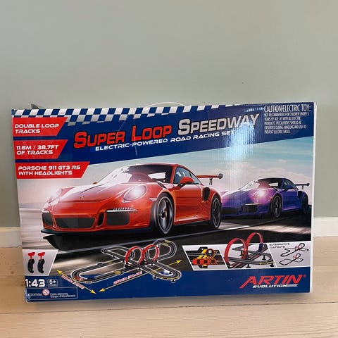 Speedwaybane fra 2021 med to loops og brugervejledning. Den ene controller/bil driller lidt indimellem. Obs, at vi har kat, så der kan være risiko for lidt medfølgende pelsfnuller.