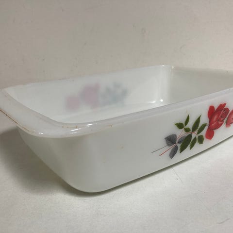 Ovnfast fad med glaslåg / stegeso i JAJ Pyrex model 509 "June Rose". Der er motiv på begge sider.