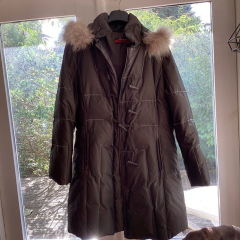 Jakke, str. 38, Taifun, Mørkebrun, Dun, Næsten som ny, Meget flot og lækket Dun jakke med aftagelig hætte.med ægte pels BASKEBJØRN i beige tone