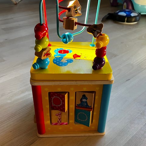 Aktivitet, aktivitetslegetøj, Sælger lille Peter Plys aktivitets ting barnet kan åbne og der efter dreje på en skive der klikker, der er et lille spejl, en lille rangle, og en klikker på biens krop.