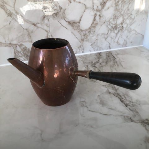 Rustfrit stål, Vintage Kaffekande med kobber mærke trekløver i bunden.