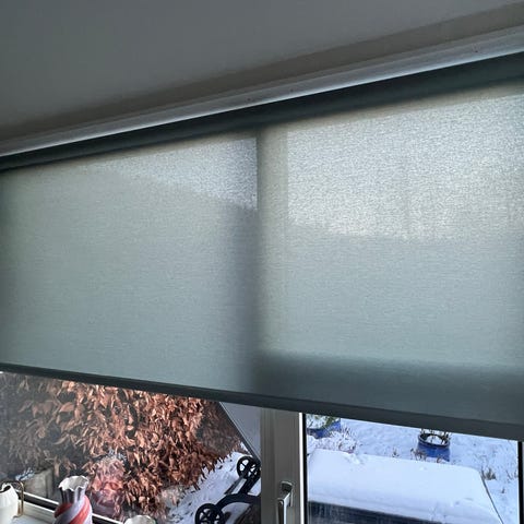 Lysgrå mørklægning med kæde og skinne i hvid.