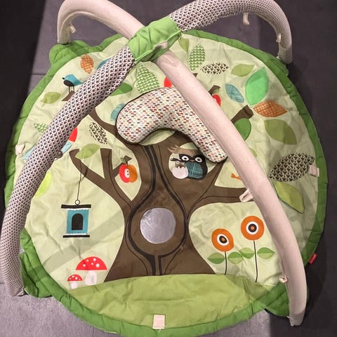 Desuden klokke, knitrende, spejl og pivlyde i selve tæppet, der har en ekstra blød og vamset midte til baby. Tæppet er tykt.
