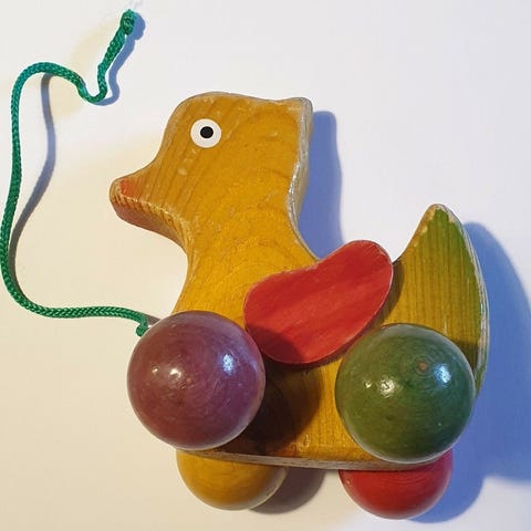 Vintage trælegetøj, Gammel trækand i træ der drejer hovedet, når den trækkes. Højde 11 cm, længde 10 cm.