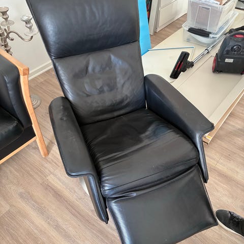 Lænestol, skind, Rødbrun lænestol fra røgfrit hjem.