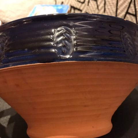 Keramik skål, Hegnetslund, Skål med turkis glasur indv, og brun keramik udv. - på 3 ben og 2 ørehanke.