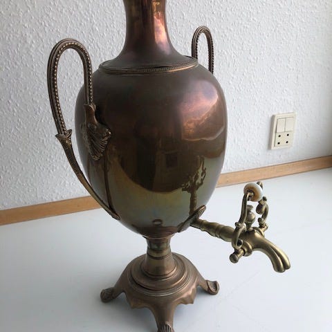 Den antikke samovar kan efter aftale leveres til og afhentes på adresse i Smørum, i Hillerød, i Liseleje, i Charlottenlund, i Valby, i Næstved, i Ganløse eller i Roskilde: Fragt kr. 35,00