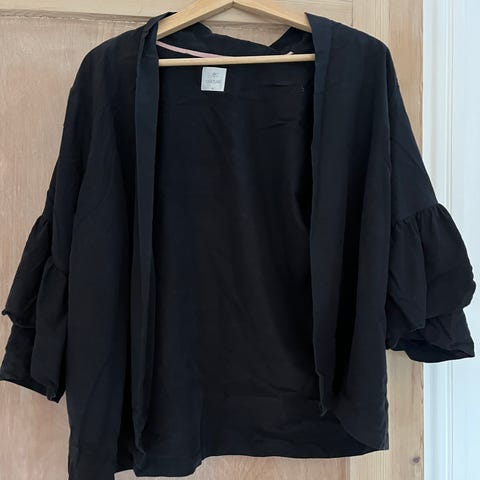 Blazeren har rund hals med skjult knaplukning, brede ærmer samt to pyntelommer foran.