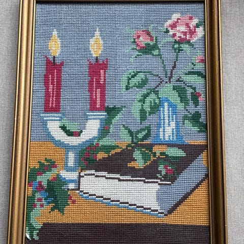 Broderet billede, Lille broderet billede med rose i guldramme.