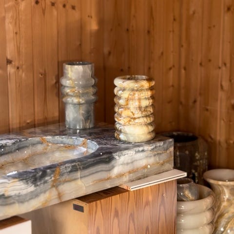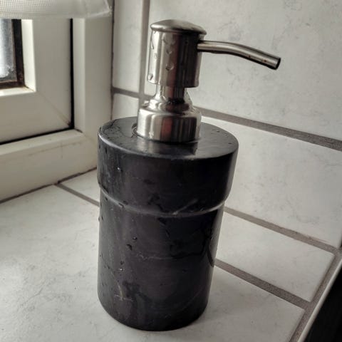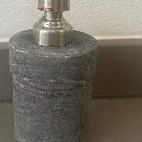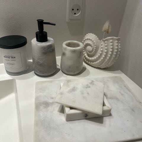 OBS! Sæbedispenseren er solgt. To marmorkrus (kan bruges til tandbørster, makeupbørster eller til små planter). Meget smukke og stilrene. Højden på krusene er 10 cm. Krusene sælges samlet for 140 kroner.