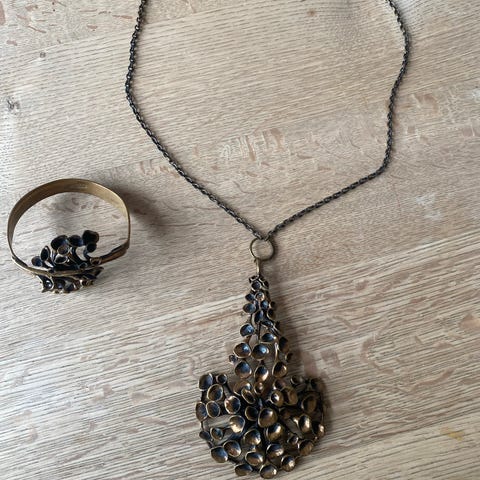 Smykkesæt, andet materiale, Brøndsted keramik, Smukkeste retro vintage smykkesæt bestående af håndlavet halskæde, broche og øreclips i keramik med den smukkeste glassur. Øreclips og broche kan evt nemt laves til ørestikker og ring, ved at ændre bagsiden.