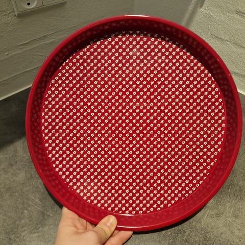 Sødahl retro serveringsbakke og dåse i serien Forglemmigej. Bakken er 30 cm i diameter, dåsen er 13,5 cm høj. Alm. brugsspor.