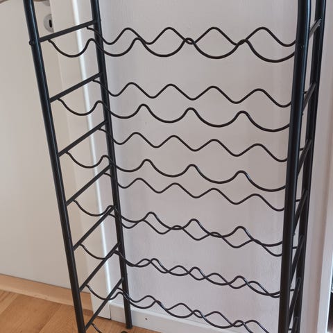 Vinreol til 11 flasker, Sort metal m. flet. Kan sendes.