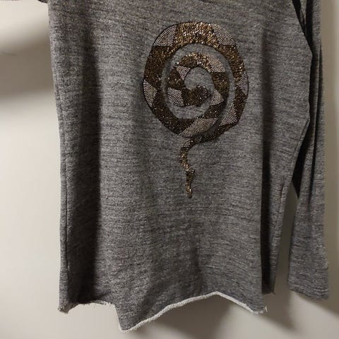 Kortærmet bluse med perlemønster ved halsudskæring, som er rund.