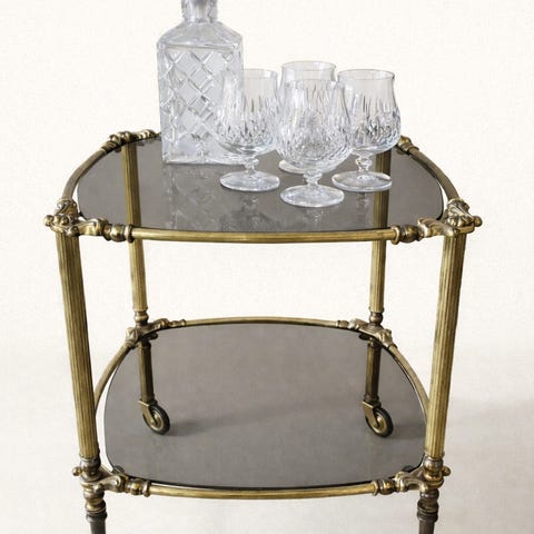 Søgeord: Serveringsvogn, rullebord, rullevogn, guld, messing, vintage, patineret, gammel, antik, barbord, gaven til manden / kvinden, julegave, fødselsdagsgave.