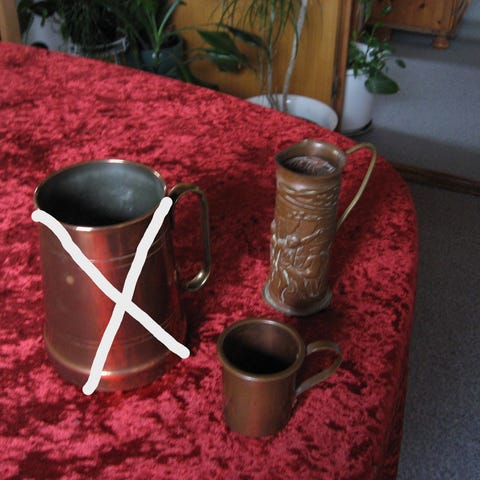 Kobberkrus, ?, Kobberkrus nittede. De 2 store krus vejer hver 240 gr. De er 11 cm høje, 5,5 cm i diameter og 9,5 cm brede med hank. De 2 små krus vejer hver 170 gr. De er 9,5 cm højt, 4,7 cm i diameter og 8 cm brede med hank. De store koster 80 kr. pr. stk, og de små koster 60 kr. pr. stk. Køb alle 4 krus samlet for 250 kr. Krusene er i rigtig pæn stand. Fast pris. Jeg sender gerne, hvis du betaler portoen.