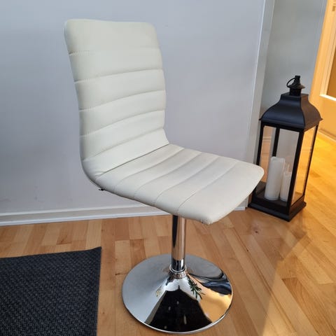 Andet, skrivebord stol, hvid kunstlæder med stål stel, 2 stk. 5 benet understel med hjul. Hjul roterer fint. Låser når der ikke er vægt på stolen. Justerbar højde med gascylinder. Kan evt. sendes. Pris per stk.