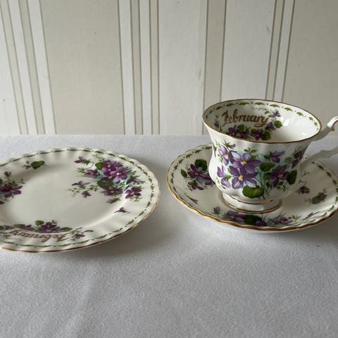 Porcelæn, Kop og underkop, Royal Albert, Sæt porcelænskop og underkop, lavet af Royal Albert fra serien Månedens Blomst.