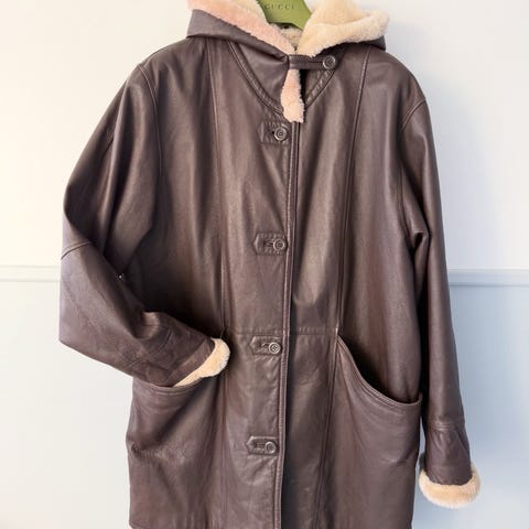 Lang frakke i brun farve, størrelse 44, til kvinder. Frakken har en hætte og er udstyret med lommer. Velegnet til køligere vejrforhold.