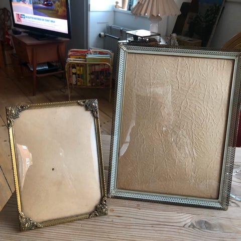 Billede 1: brun træramme med "guld" kant. Rammen måler ca, 27,5 cm x 22 cm. Billedmålet er 18 cm x 24 cm. Har to stk. Ubrugte.