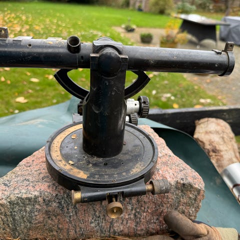 Andre samleobjekter, Teodolit F.A.Thiele, 170 år gammelt nivelleringsinstrument fremstillet af F. A. .Thiele Kjøbenhavn. Helt intakt, fin optik og libelle, stadig brugbar, efterset på værkstedet 1877, på senere fod til udstillingsbrug. ca. 30 cm lang og 17 cm høj. Var blevet væk, men er nu dukket op igen.