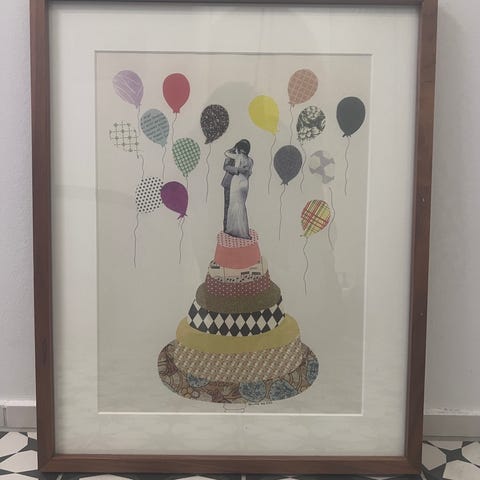 Flot og fantasifuld print af håndlavet collage med et skønt mix af dyr og tivoli.